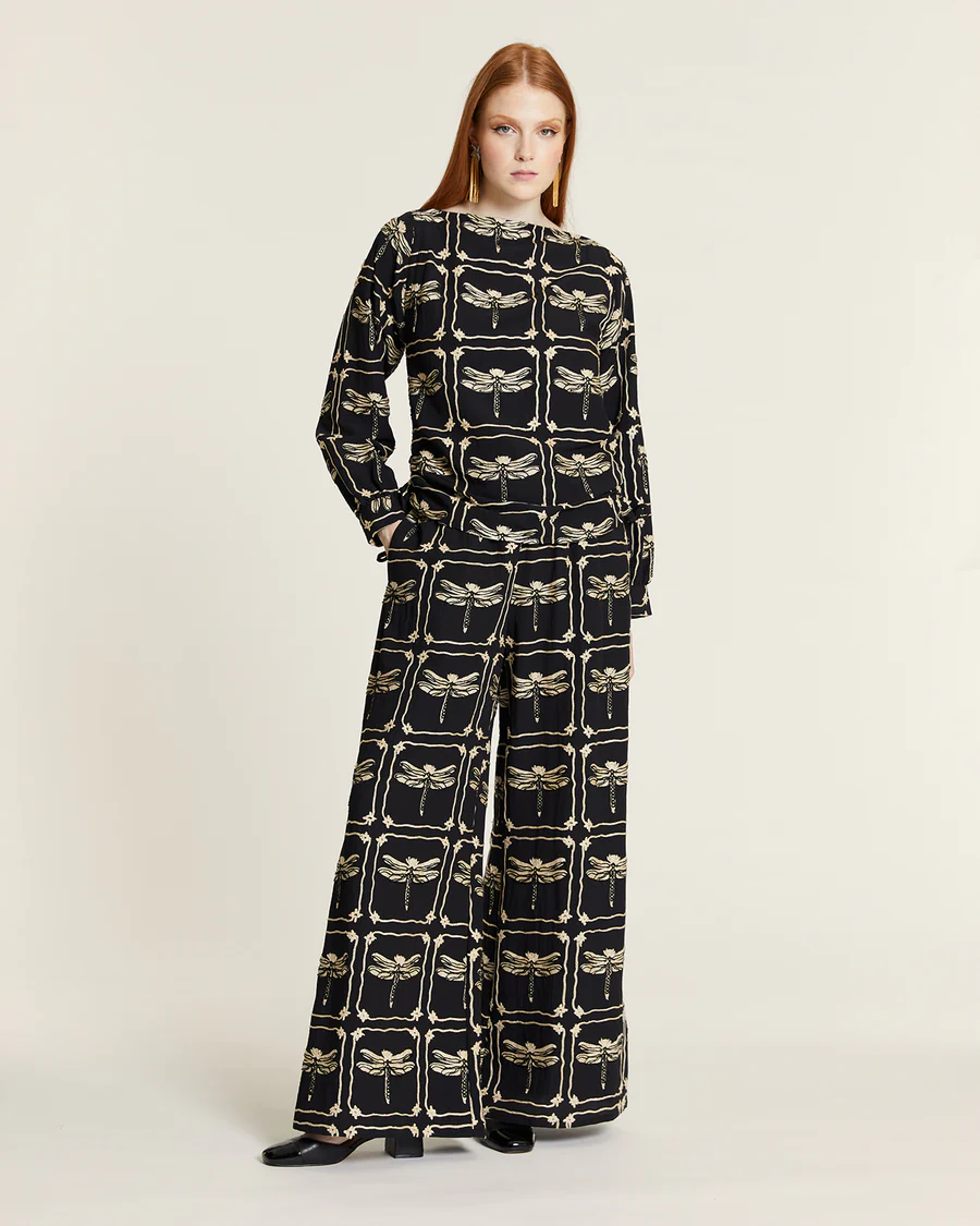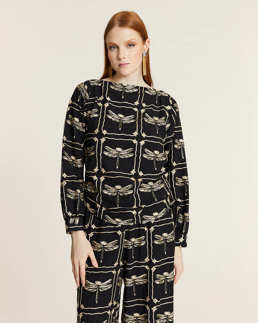 Blusa con bordado de libélulas, mangas largas rectas con puño abotonado y largo a la altura de la cadera.