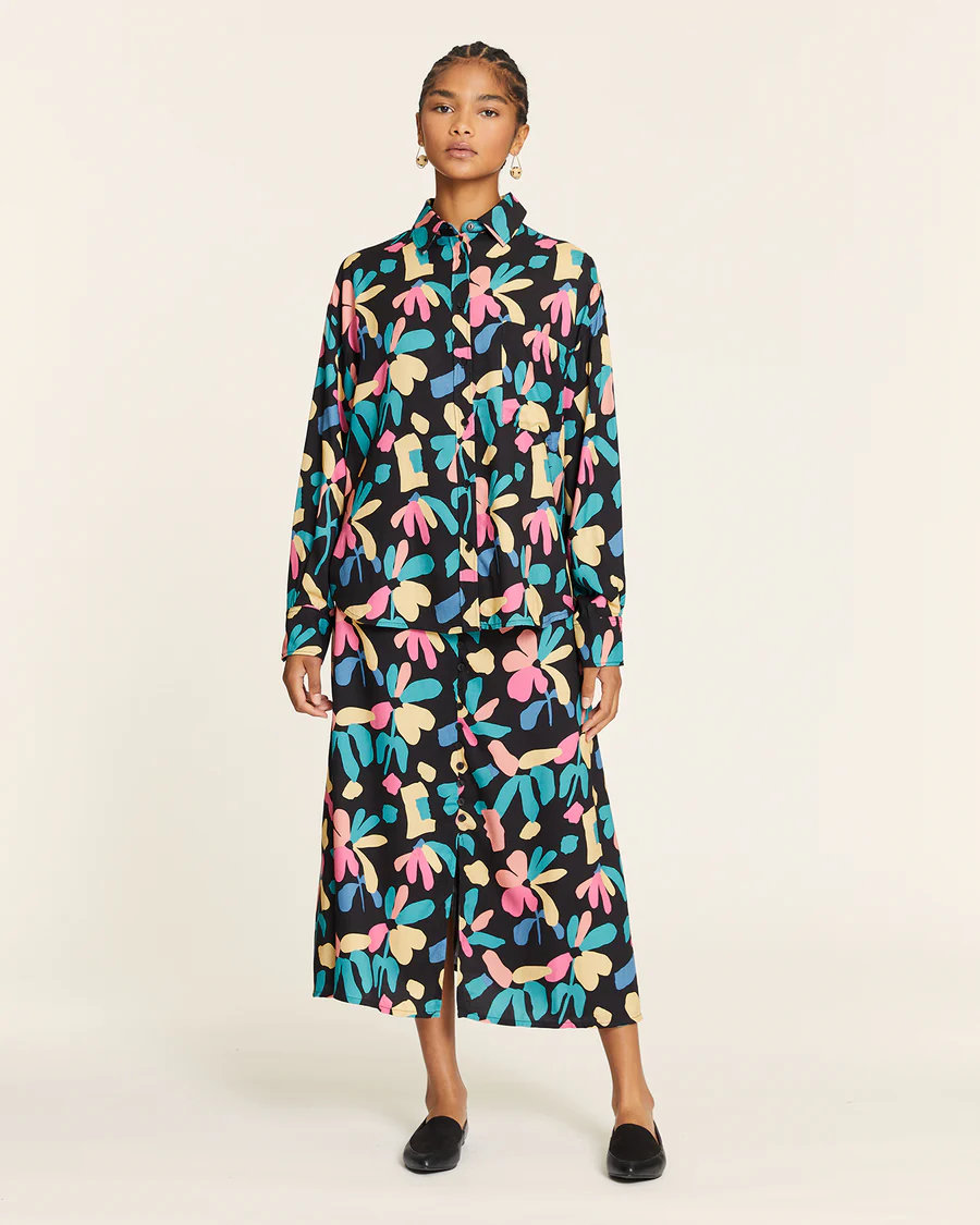 Camisa pétalos abotonada en el centro, cuello regular, mangas largas rectas y puños cuadrados.