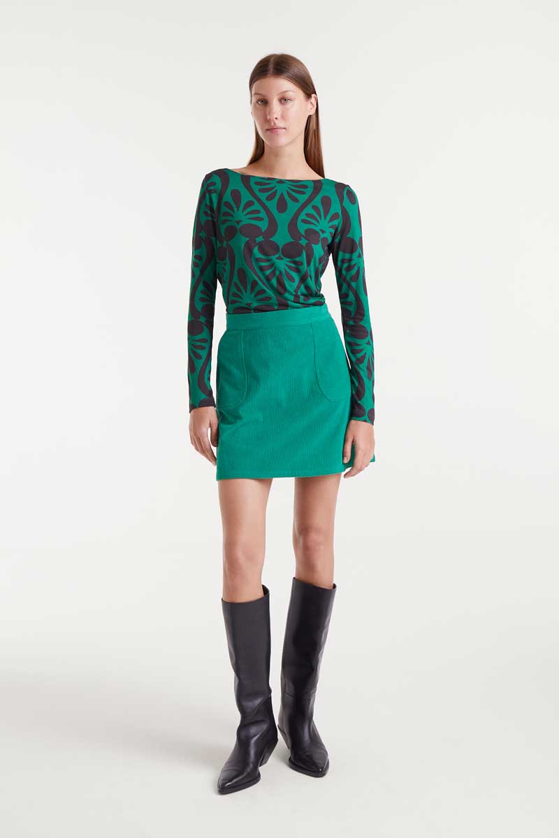 Camiseta de color verde con estampado Baroque. Con escote barco y manga larga.