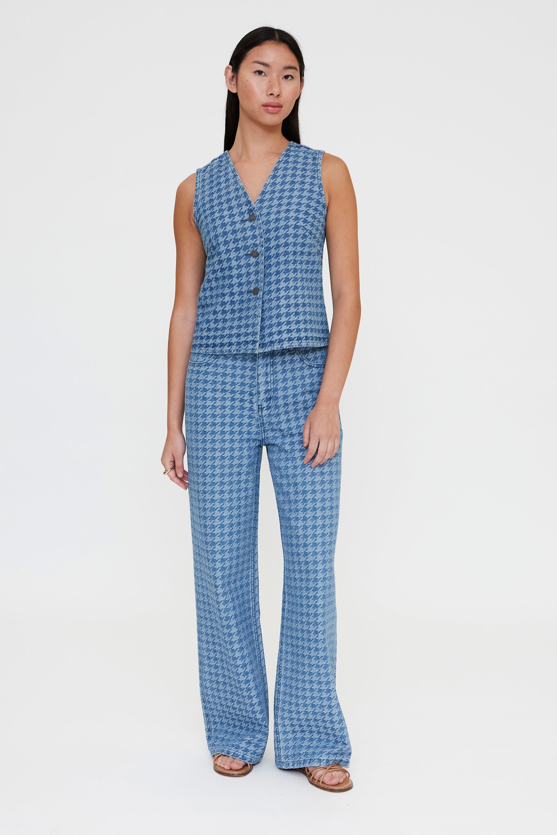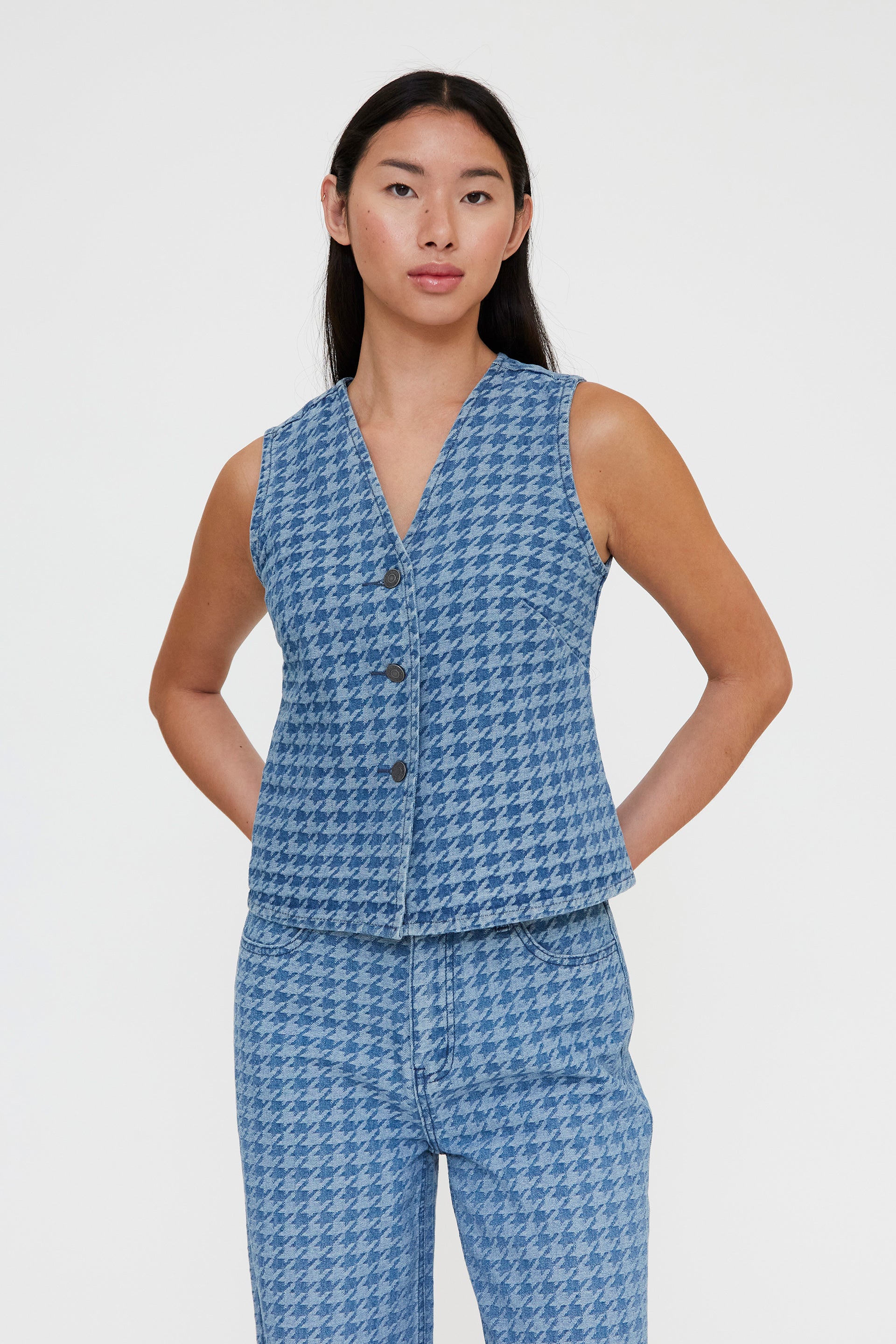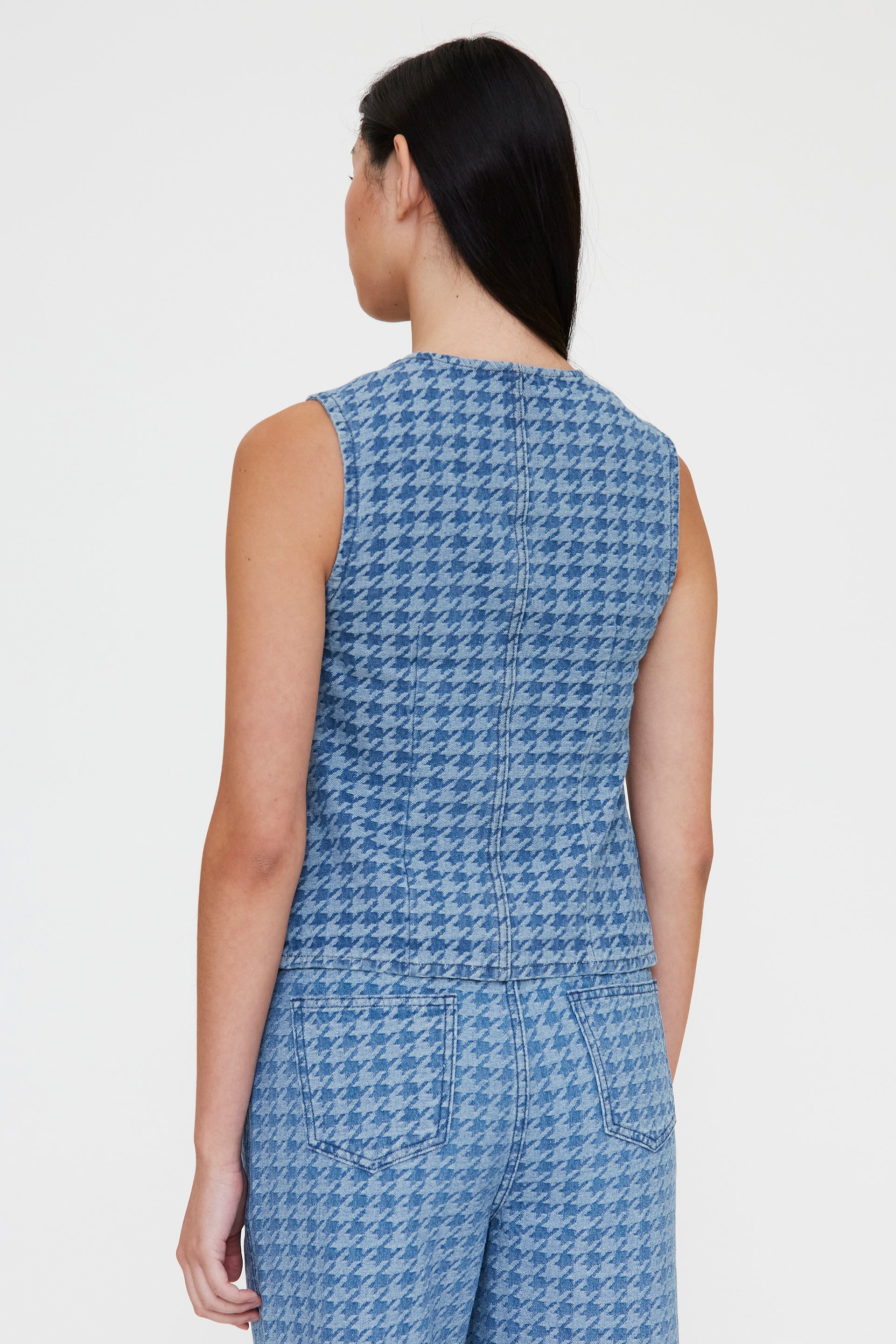 Chaleco estampado pata de gallo en denim de color azul. Cuello con escote pico y sin mangas. Cierre frontal con botones. La modelo mide 173 cm y lleva la talla S.