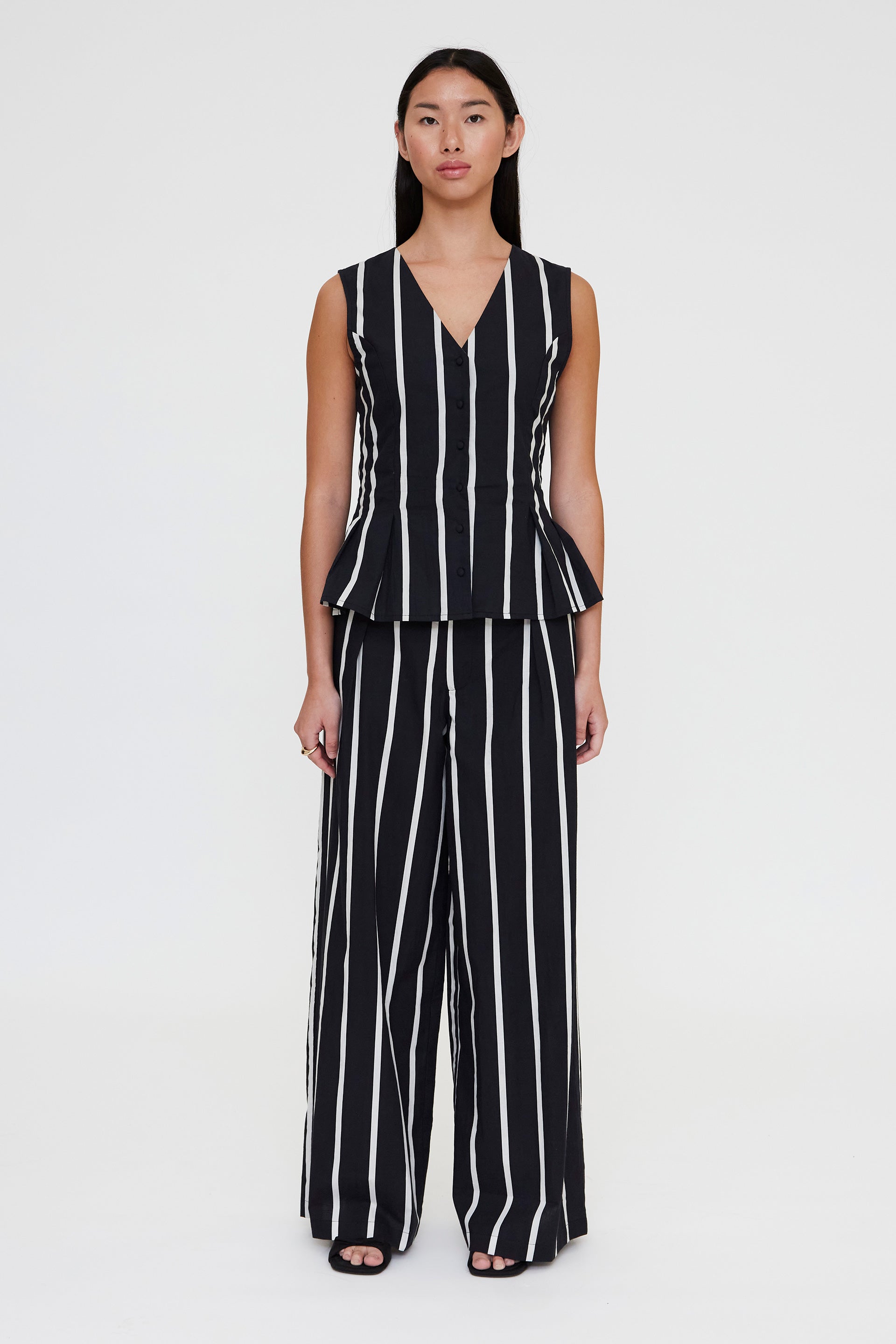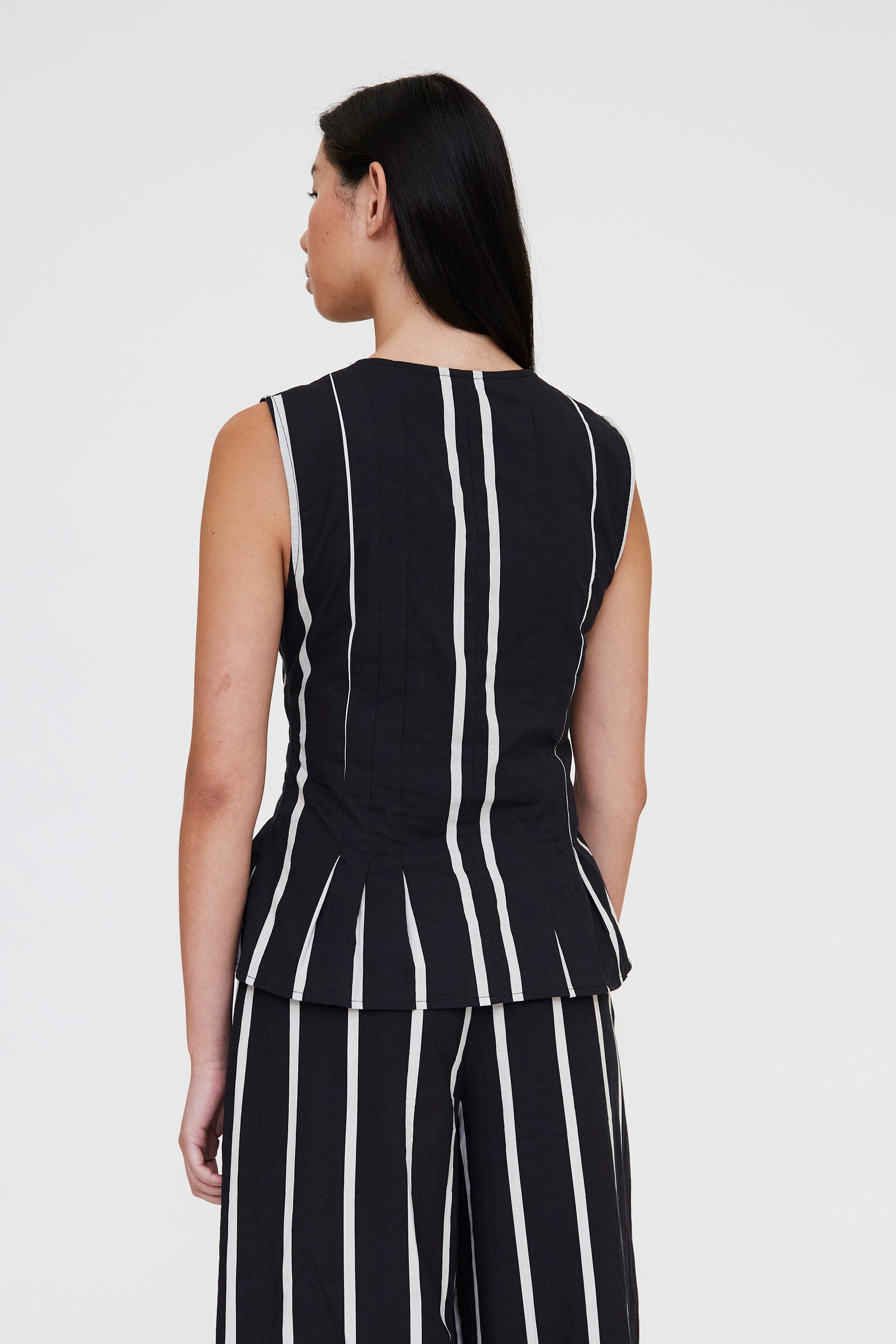 Chaleco de tejido 100% algodón con estampado rayas. Cuello pico y sin mangas. Cierre frontal con botones forrados negro. Detalle de plisado.Forro interior. La modelo mide 173 cm y lleva la talla S.