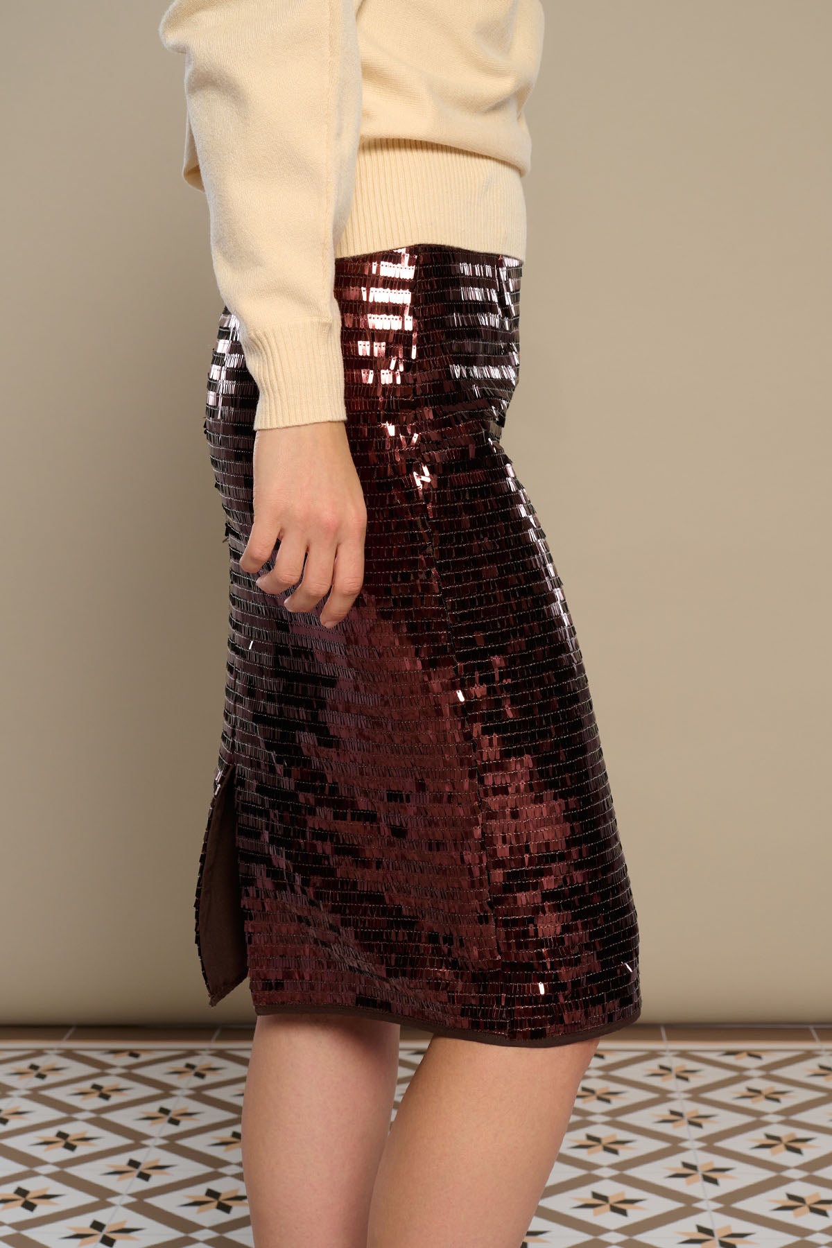 Falda midi de lentejuelas. Forro interior. Cierre con cremallera trasera oculta en costura.