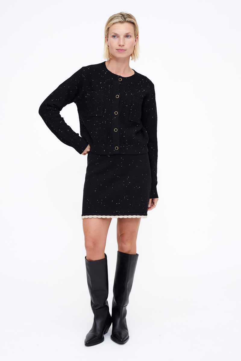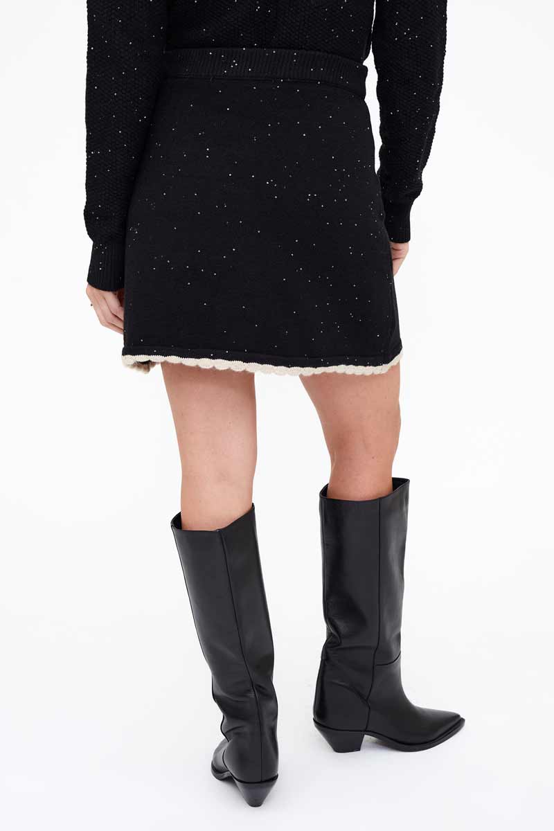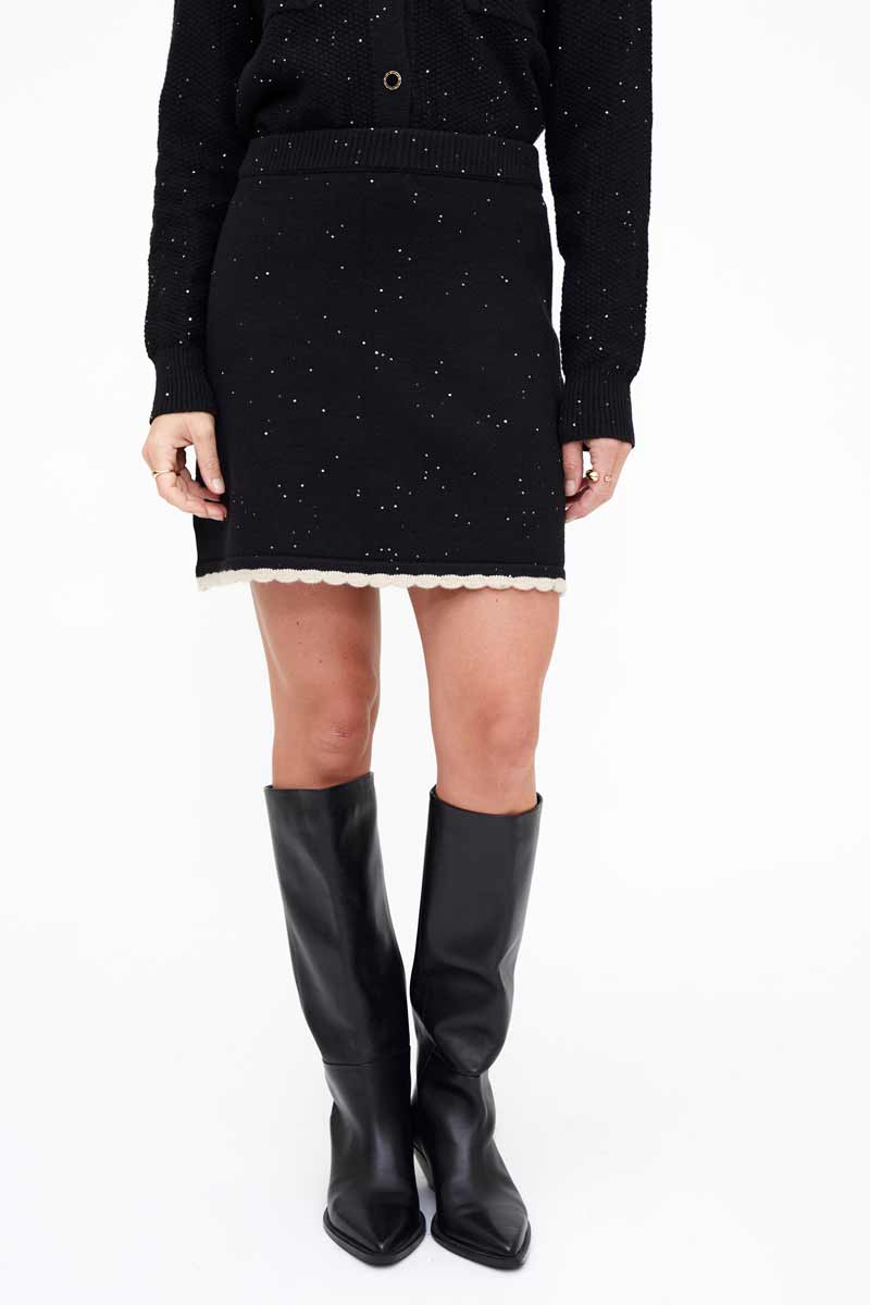 Falda corta de punto negro. Detalle de lentejuelas y remate con punta en color beige.