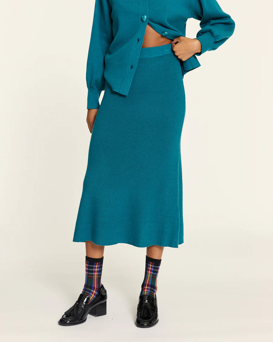 Falda de punto verde, cinturilla elástica, por debajo de la rodilla.