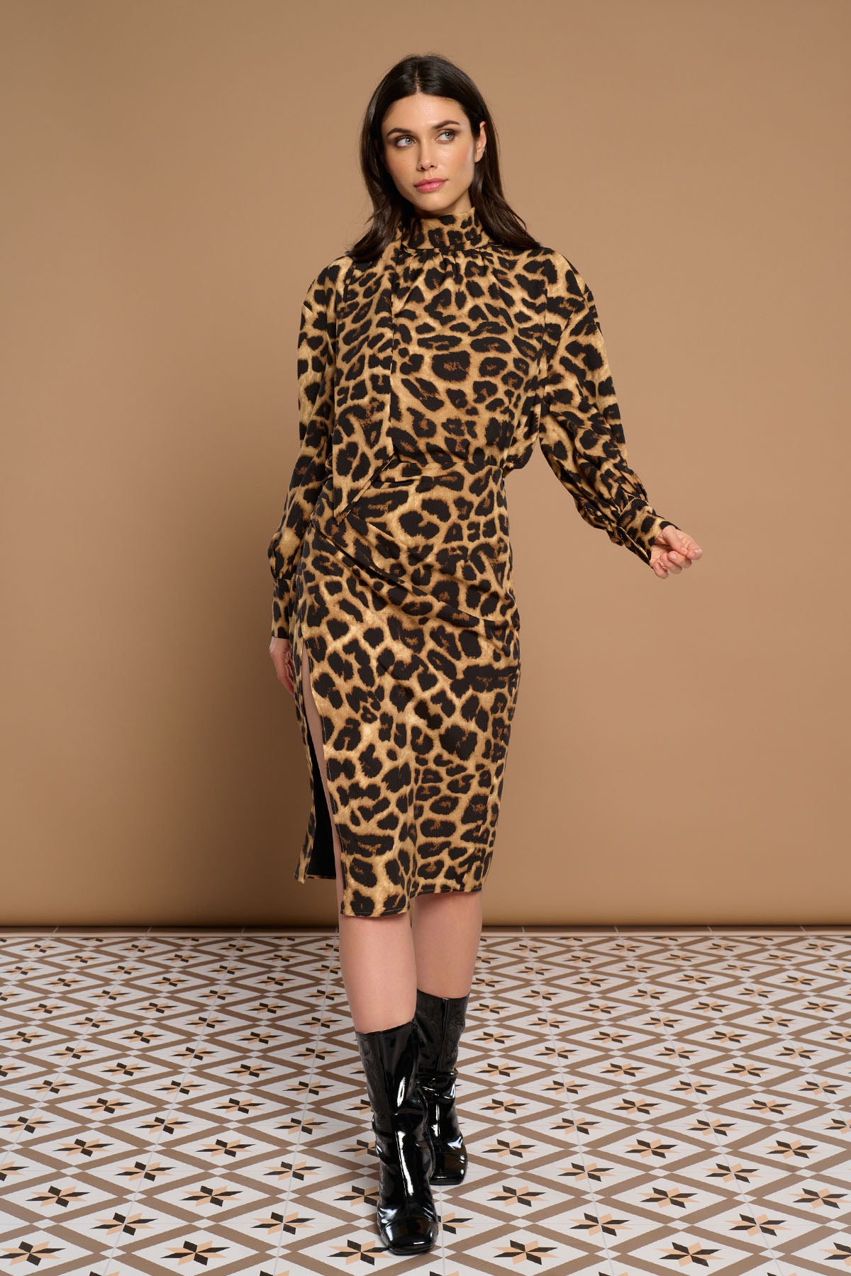 Falda midi de tiro alto. Abertura lateral. Estampado animal print. Cierre con cremallera lateral izquierda oculta en costura.