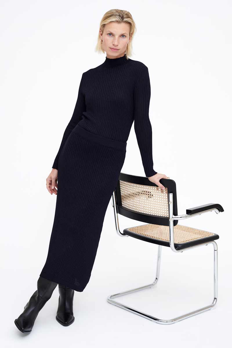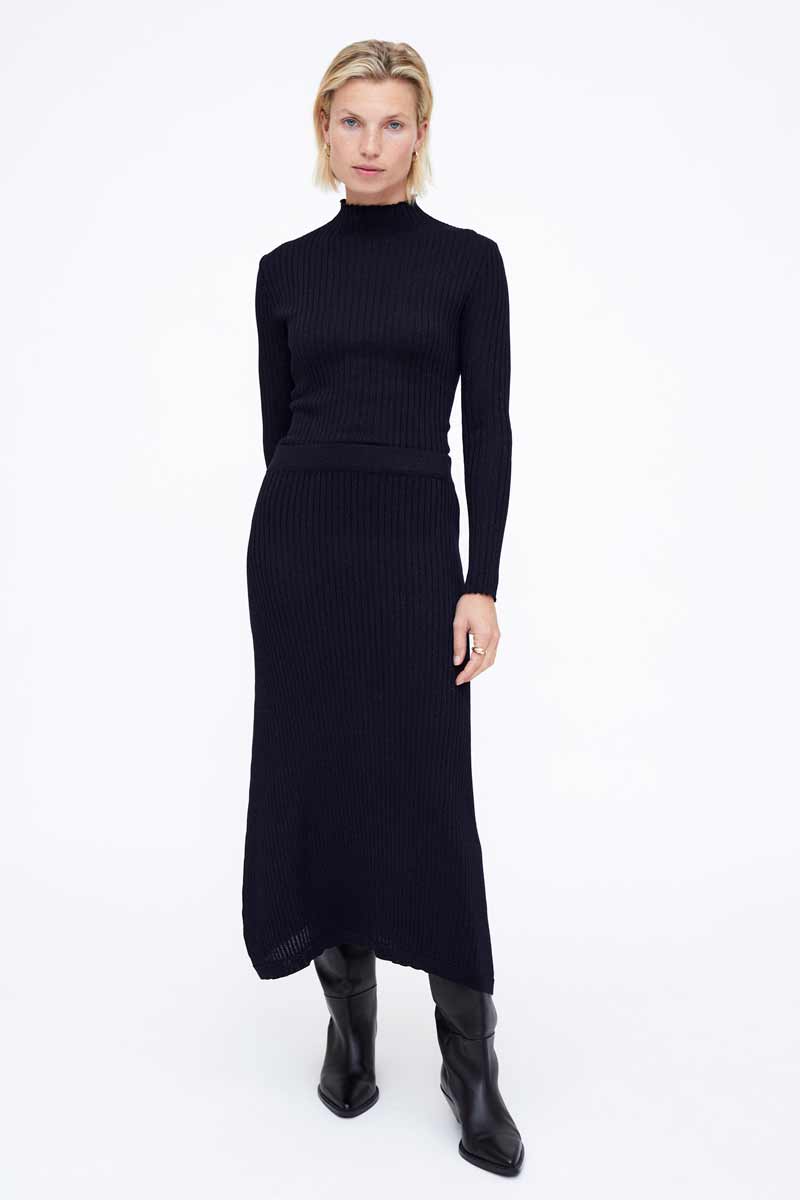 Falda midi en punto de canalé en color azul marino. Con cintura elástica y detalles en lurex (brillo).