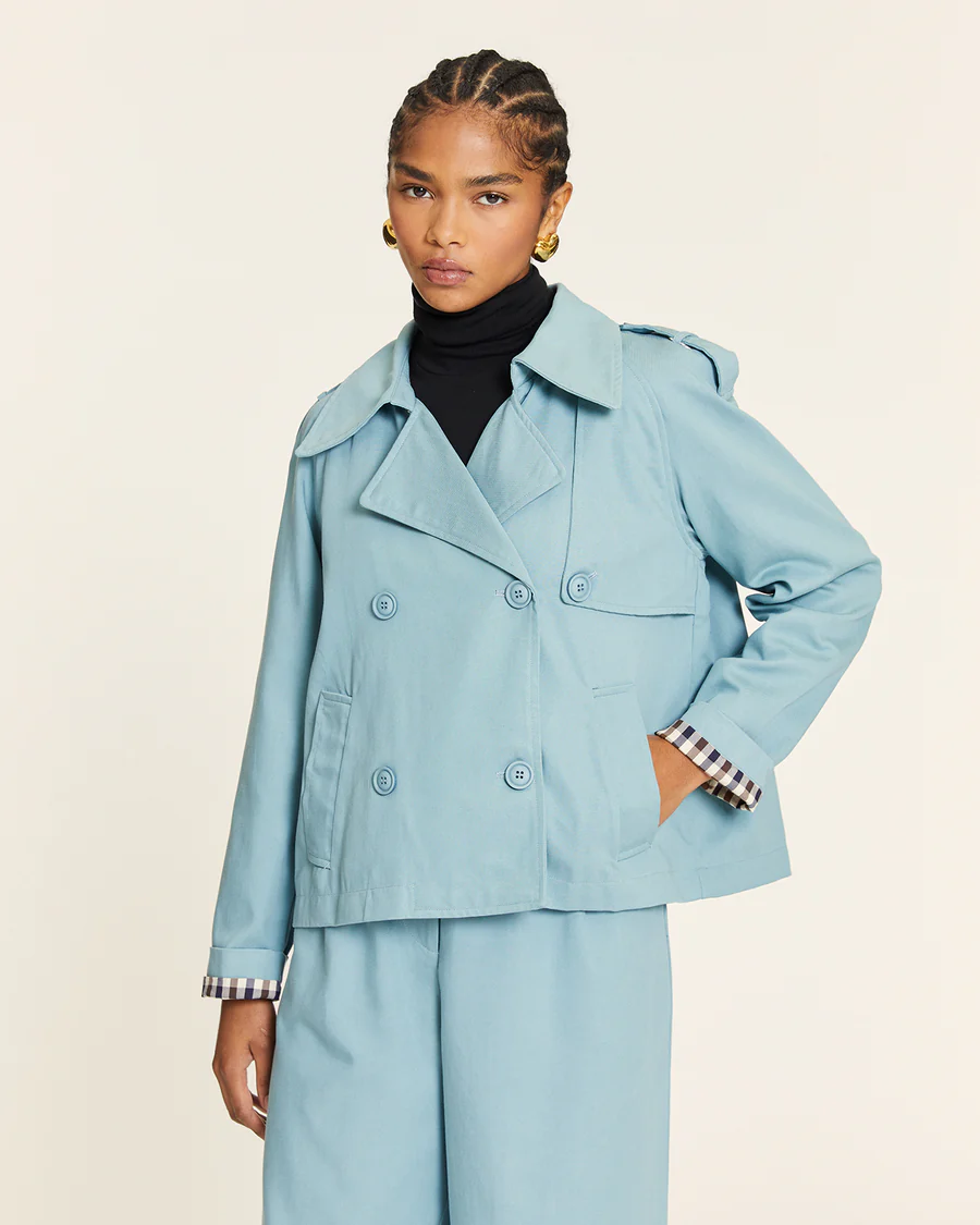 Gabardina corta de color azul con forro de cuadros, solapa de pico, con abotonadura cruzada de cuatro botones y puño de manga reversible. Tiene bolsillo integrado.