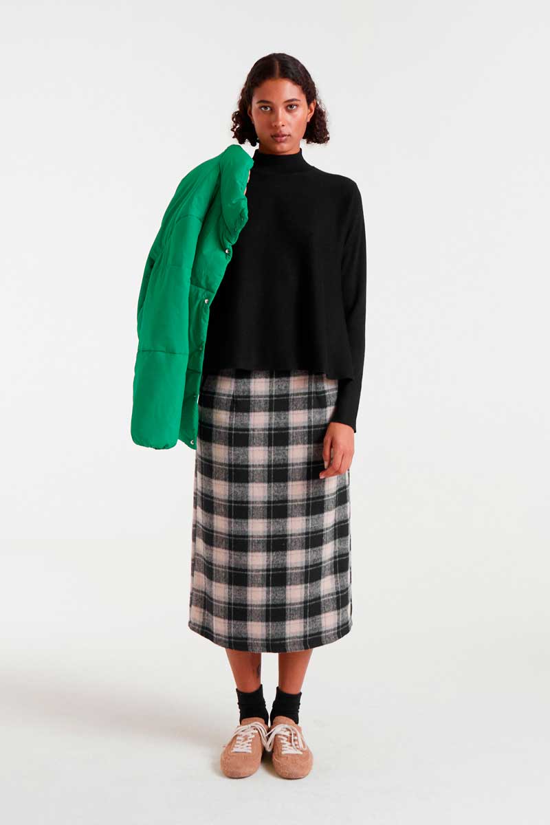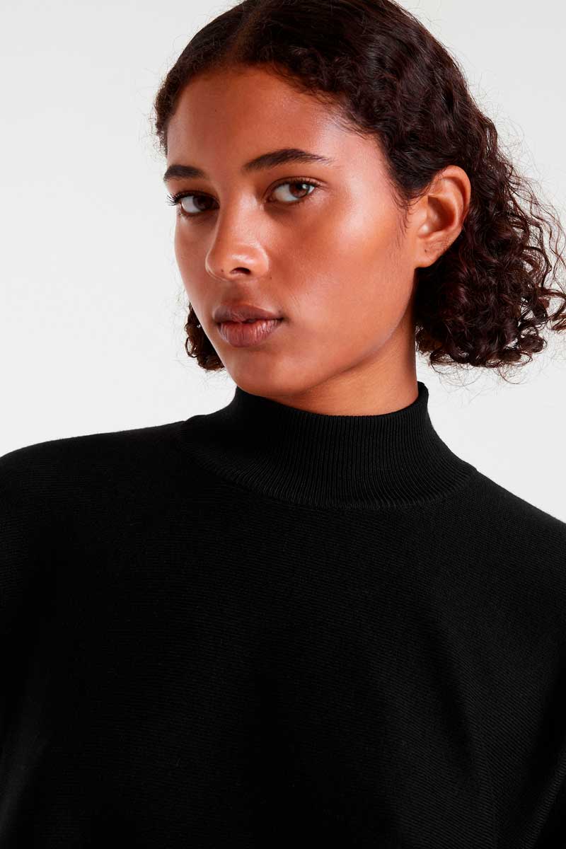 Jersey de punto color negro. Con cuello perkins y manga larga. Modelo de corte evasé. Detalles en rib.