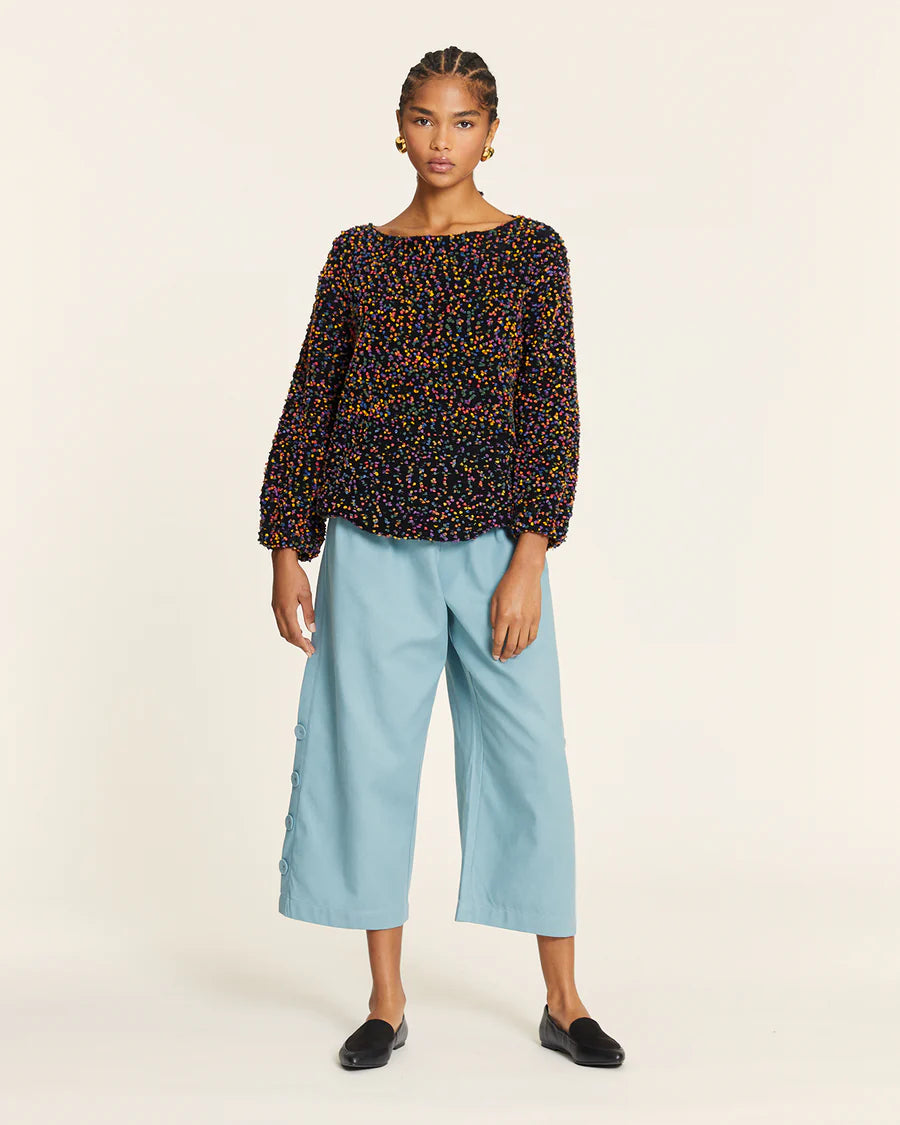 Jersey mini pompón negro, cuello barco, manga abullonada y puño cone elásrtico a la altura de la cintura.