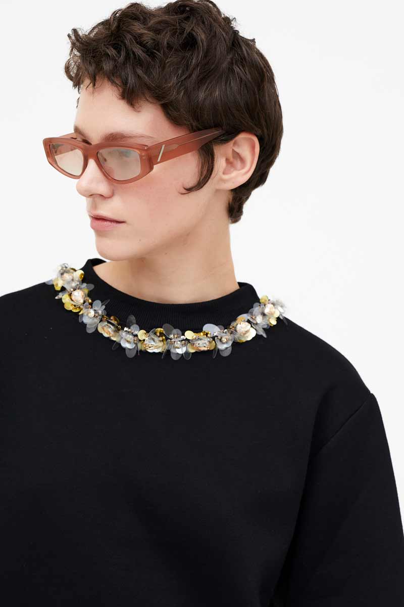 Sudadera de color negro con tejido felpa polar. Cuello redondo con detalles en joya y manga larga con terminaciones rib.