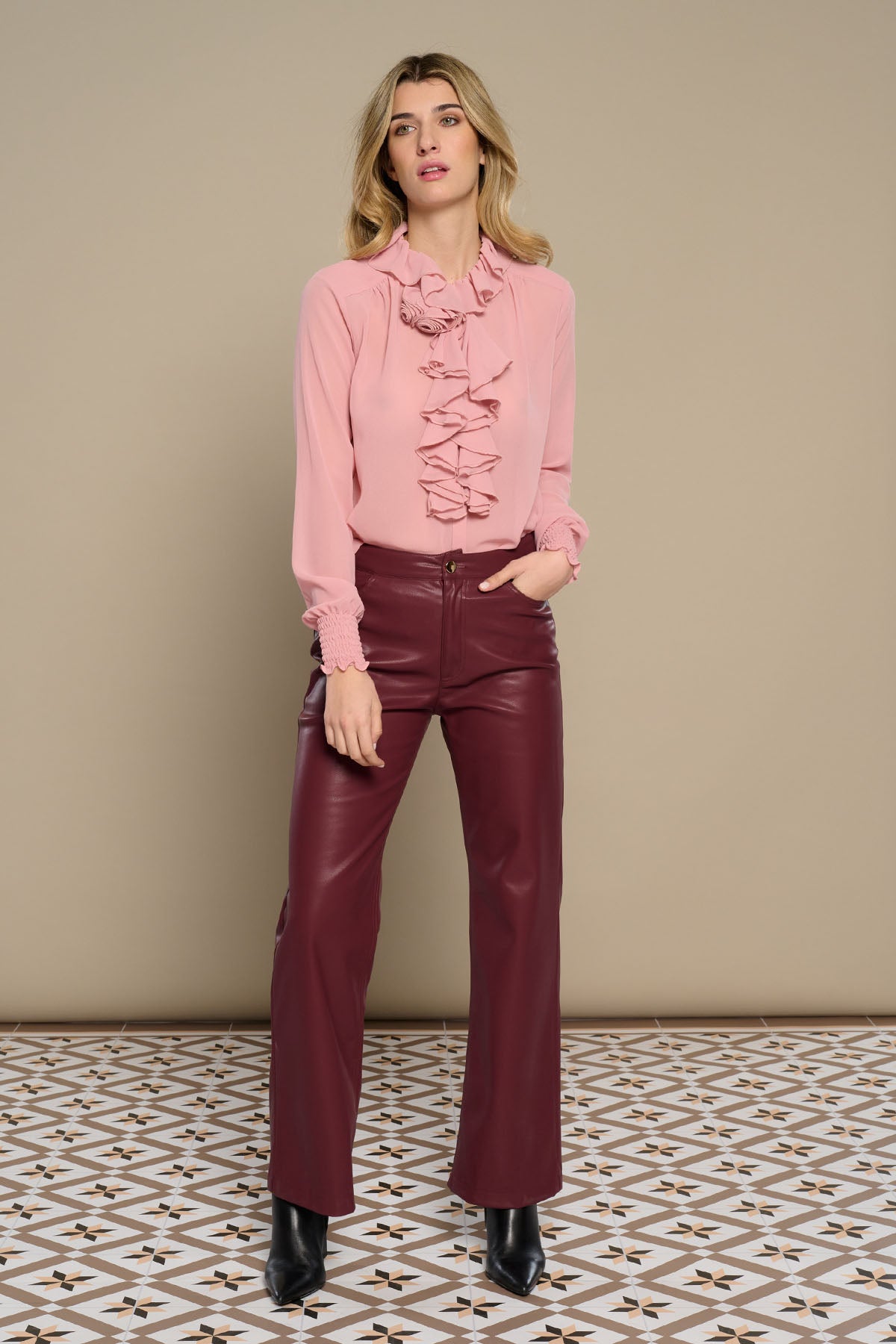 Blusa con cuello redondo y manga larga. Puños con panal de abeja. Detalle de volantes en frontal. Tejido fluido.