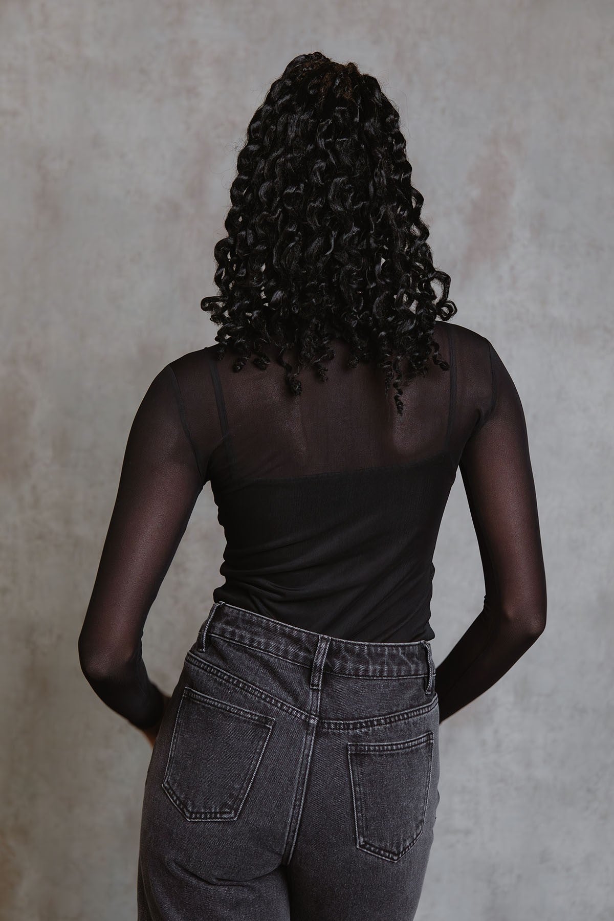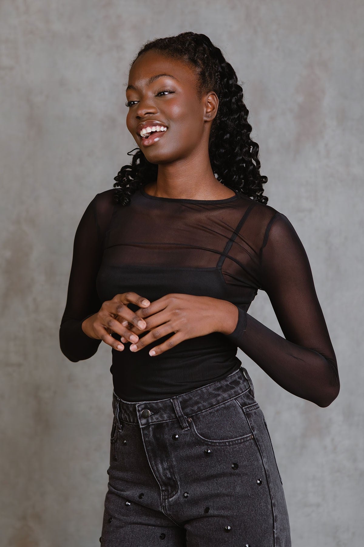 Camiseta de cuello redondo y manga larga. Semitransparente de tejido elástico. Forro interior elástico de tirantes.