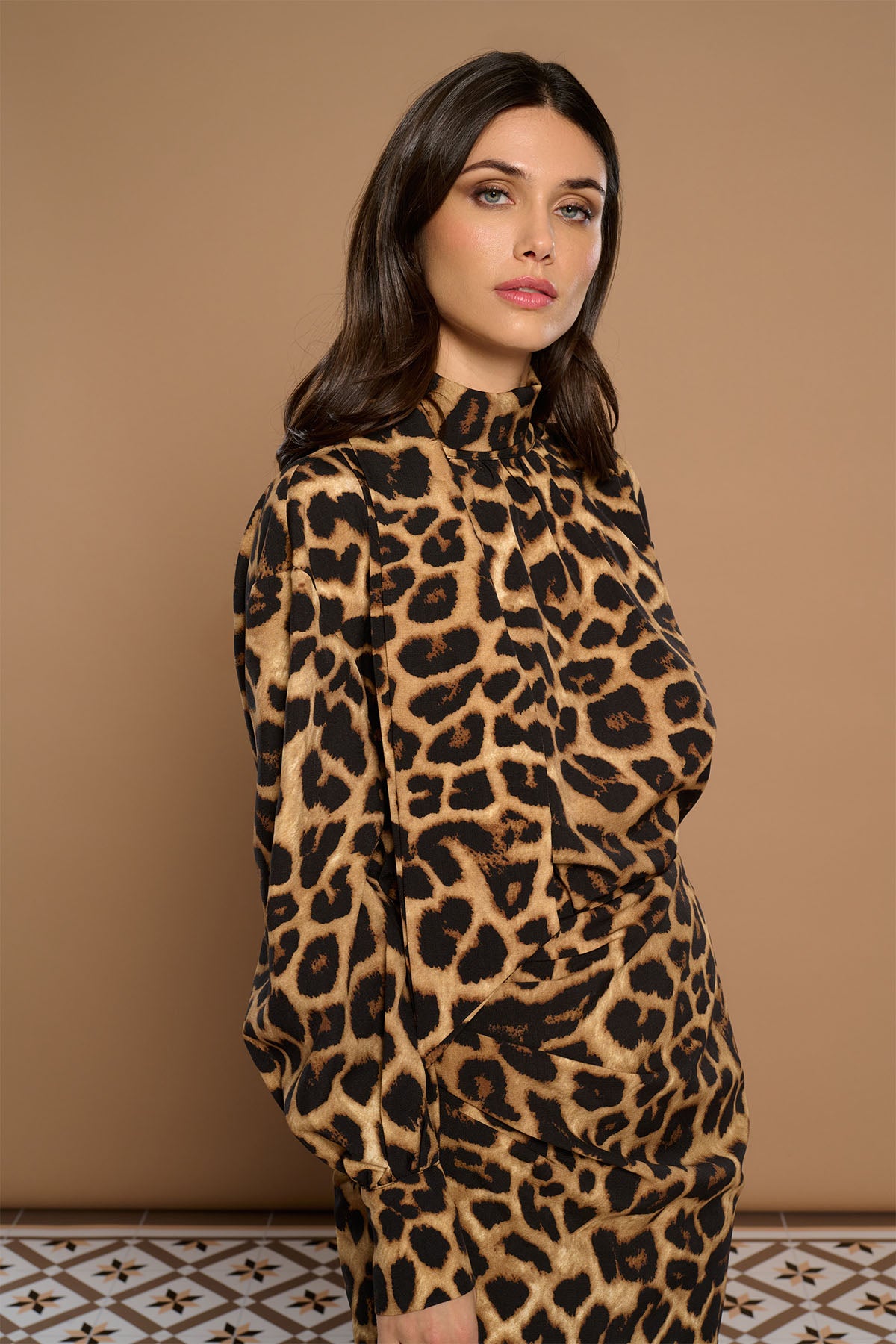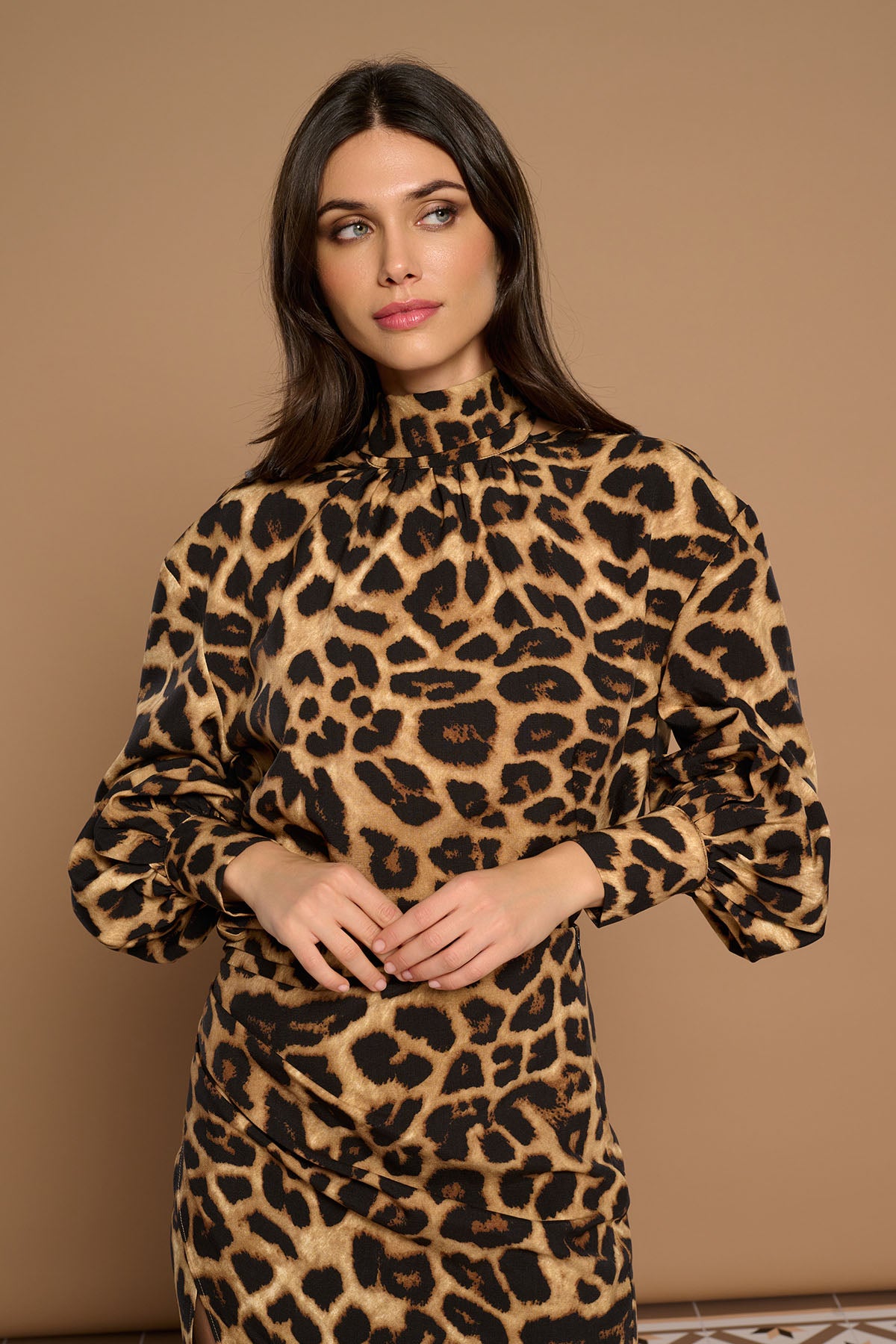 Blusa de cuello perkins. Manga abullonada ajustada en puño. Estampado animal print.