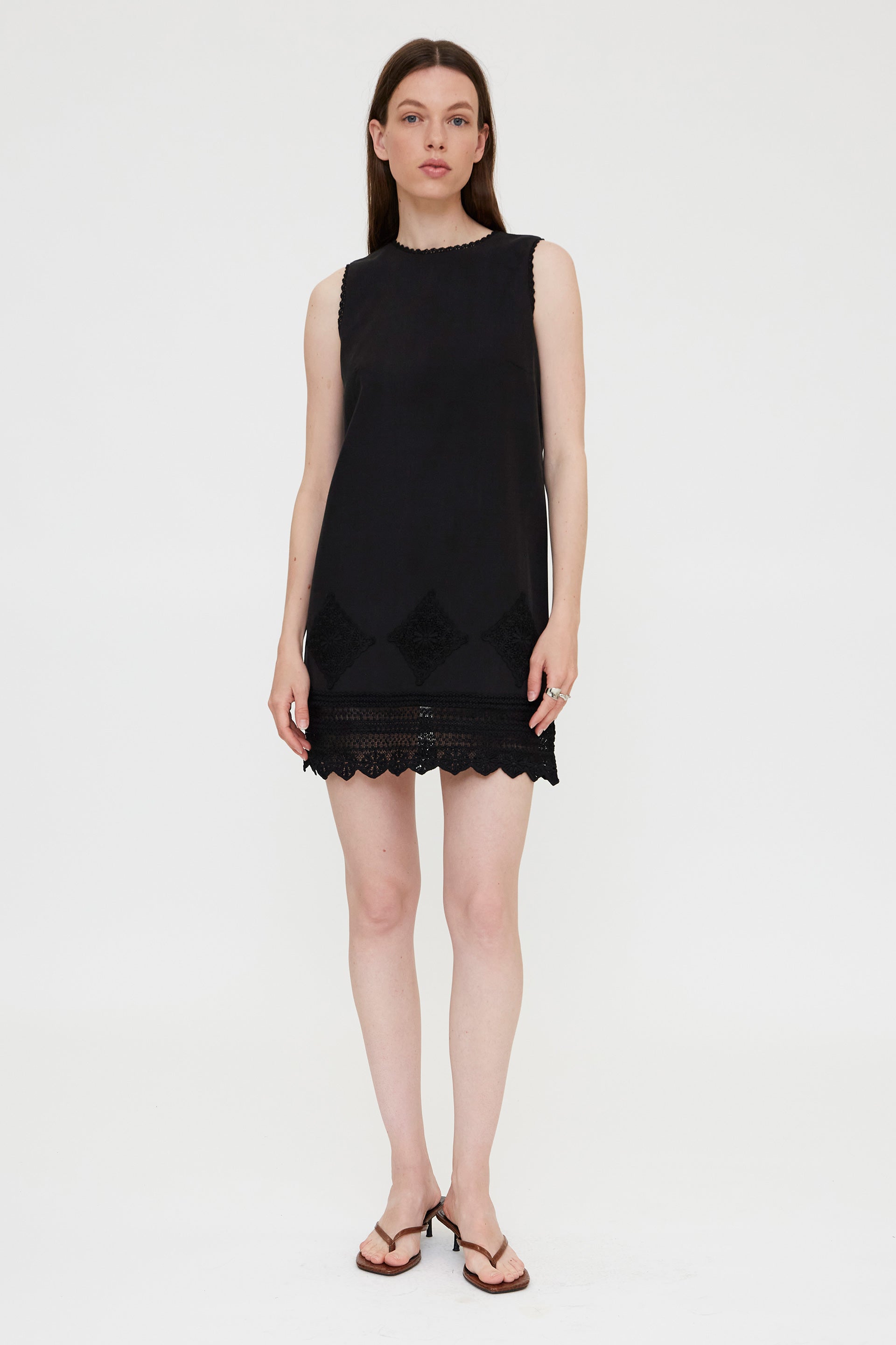 Vestido corto con tejido crepé de color negro. Cuello redondo y sin mangas. Detalles con ribete de encaje. Cierre posterior con botón. Forro interior.La modelo mide 178 cm y lleva la talla S.