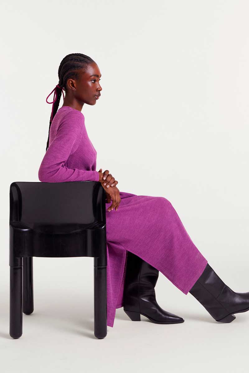 Vestido largo con tejido punto canalé de color magenta. Cuello redondo y manga larga. Hombro ligeramente caído. Detalle lazado lateral.