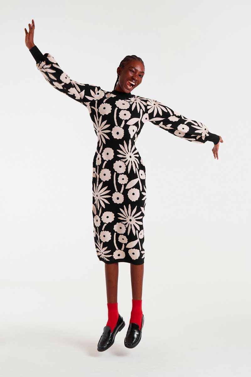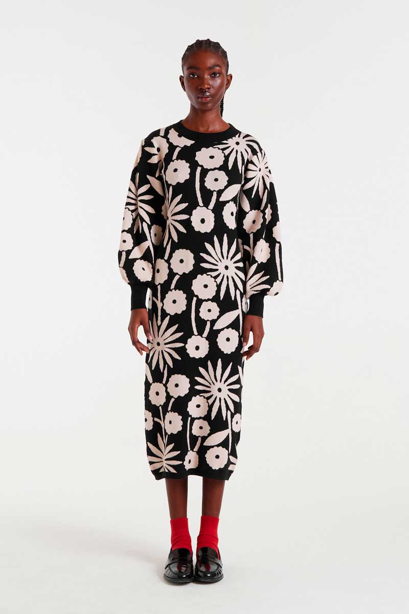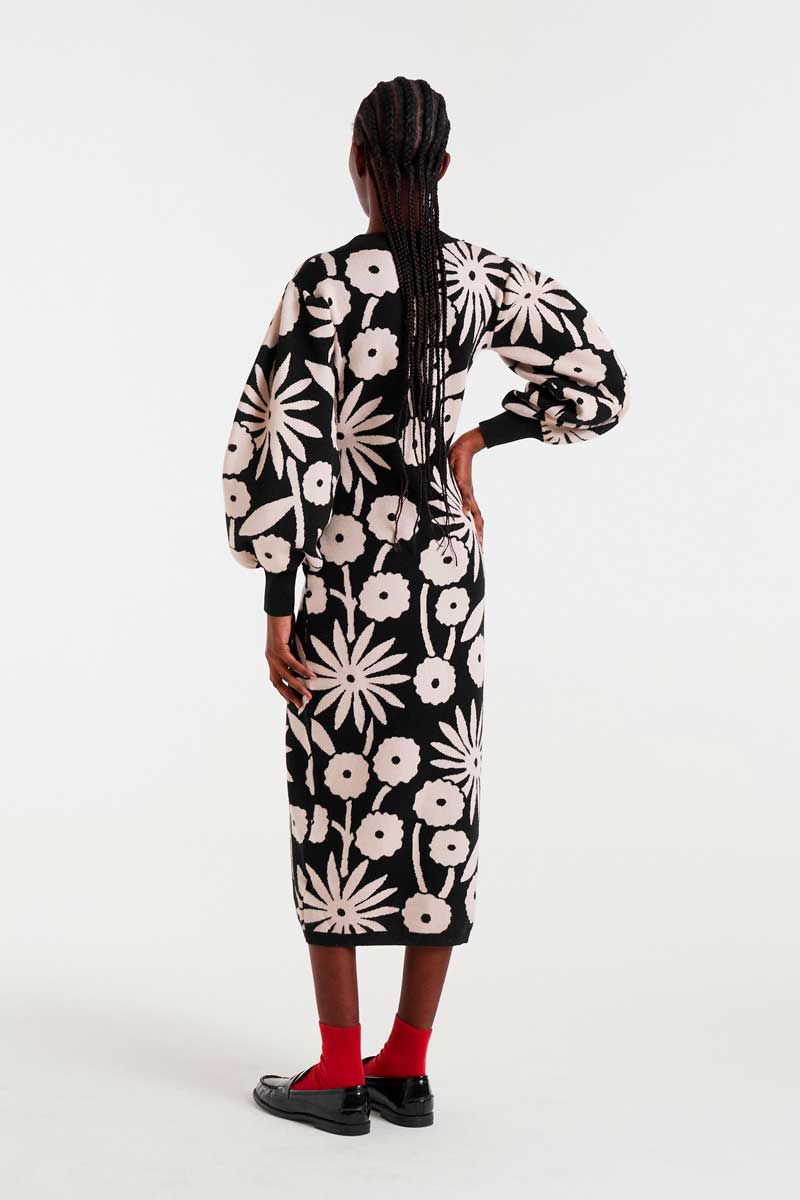 Vestido midi jacquard con estampado Tofu. Con cuello redondo y manga larga abullonada. Detalles en rib.